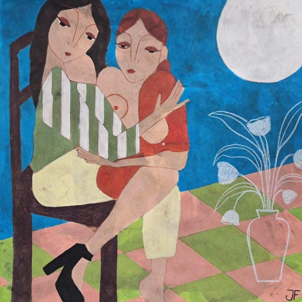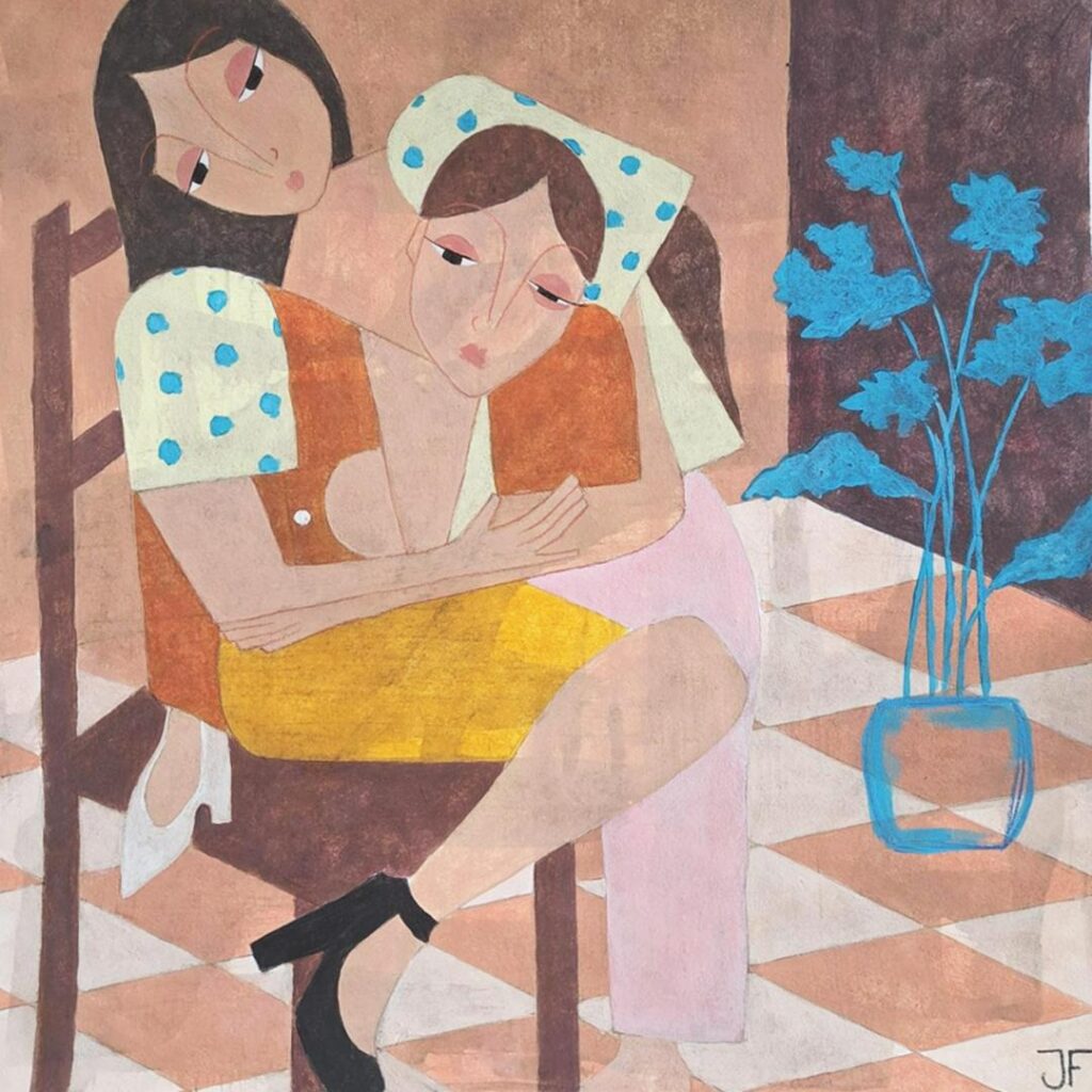 Les œuvres sont accompagnées d’un texte poétique écrit par Valentin Mazières, inspiré de la chanson Frangine d’Anne Sylvestre. Ses mots prolongent l’émotion, en écho aux gestes et aux regards.